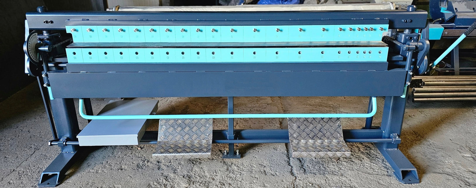 The machine frame is manufactured from heavy-duty steel components to ensure long-term stability and bending accuracy. The hardened clamping beam provides uniform pressure across the entire working length.
